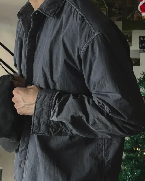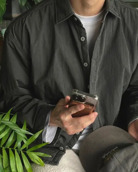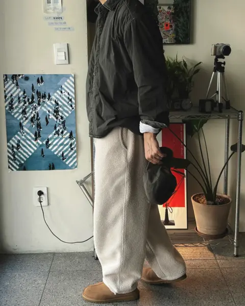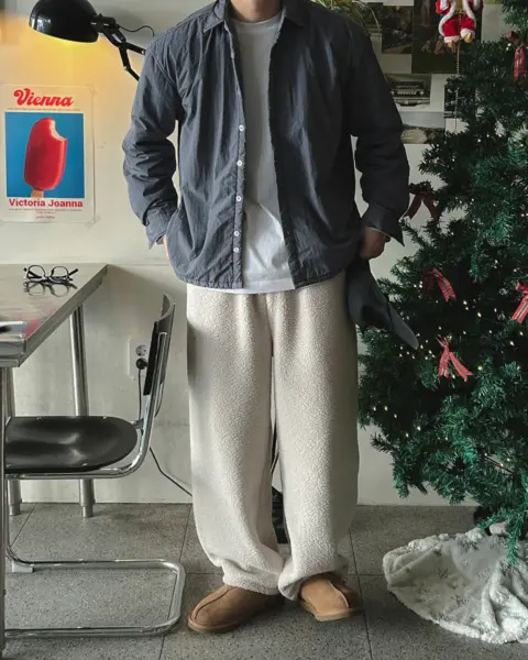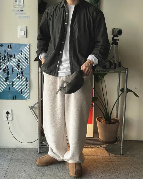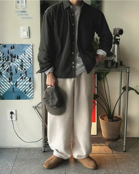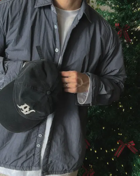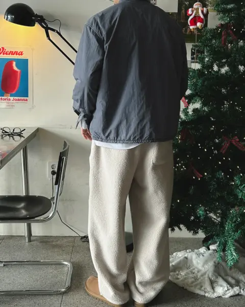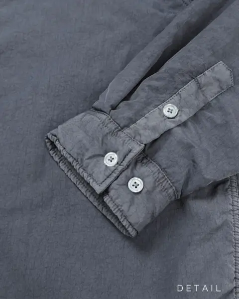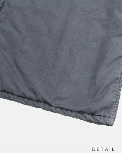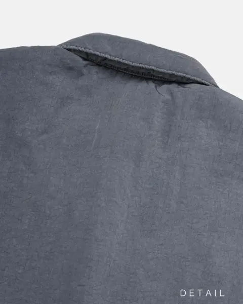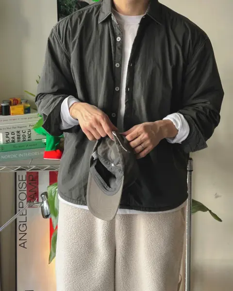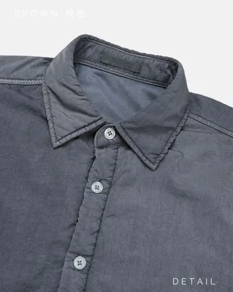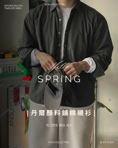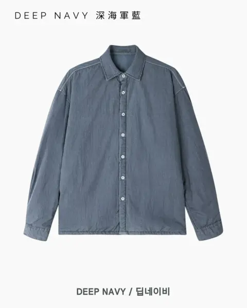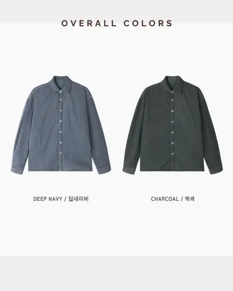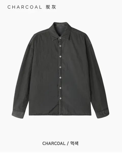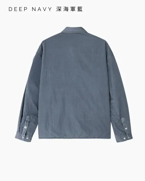 這款是「피그먼트(顏料染)」色感的輕薄鋪棉襯衫外套,填充厚度約 1oz,屬於不會太厚重、也能疊穿在外套裡的那種保暖層。版型為 F,官方說明適合約 95–105 的日常穿著範圍,走俐落不膨的輕機能路線。