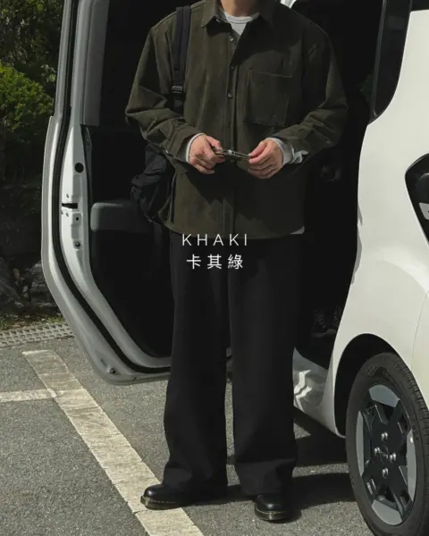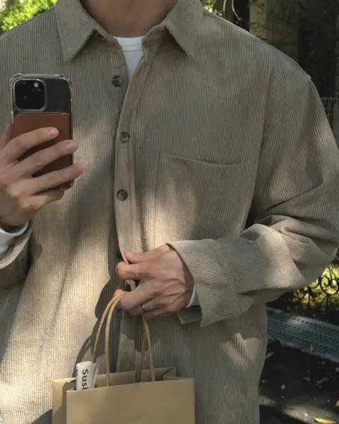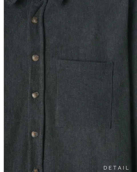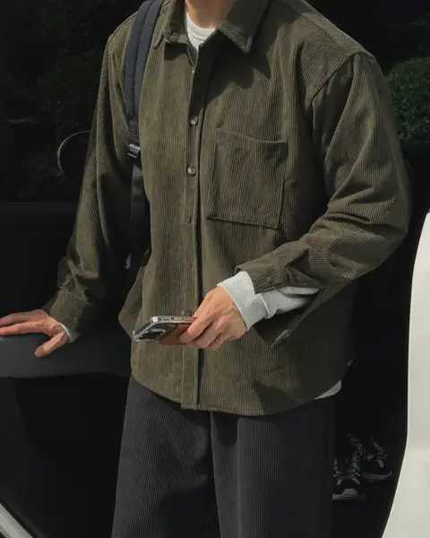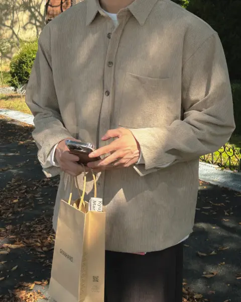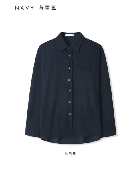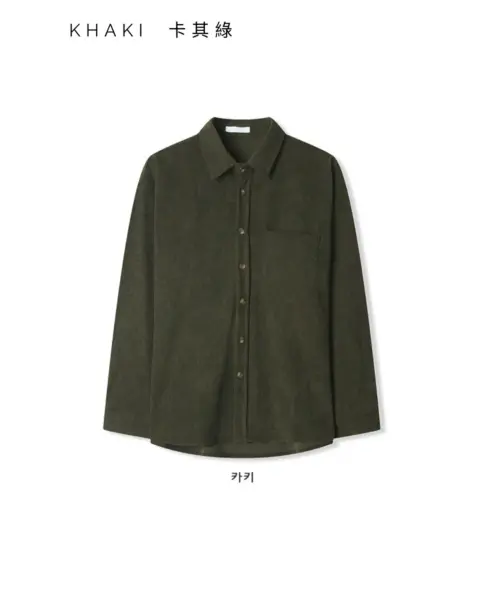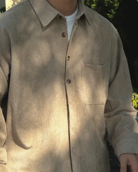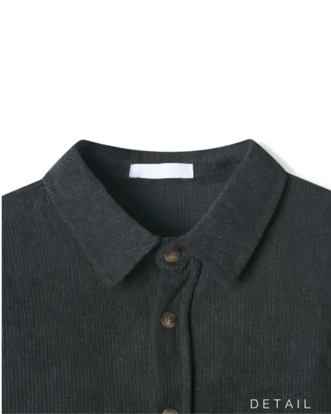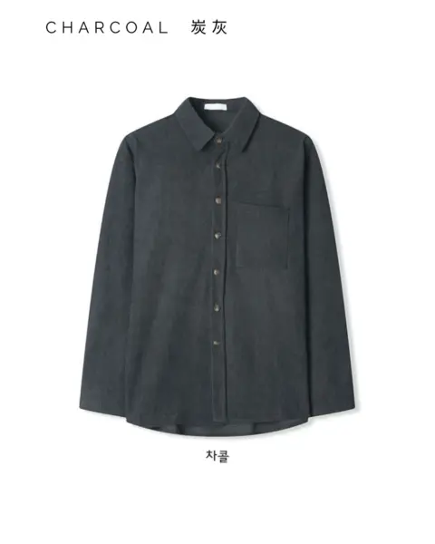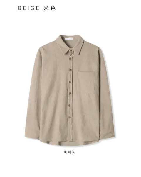 以「燈芯絨 골덴」面料製作的寬鬆版型襯衫,厚度偏有份量,穿起來更像外套感的襯衫外搭;單穿也行,搭在 T-shirt 外面當層次外套更好看。此款為海外生產,官方主打價格友善;尺寸為 F,建議穿著範圍約 95–110。