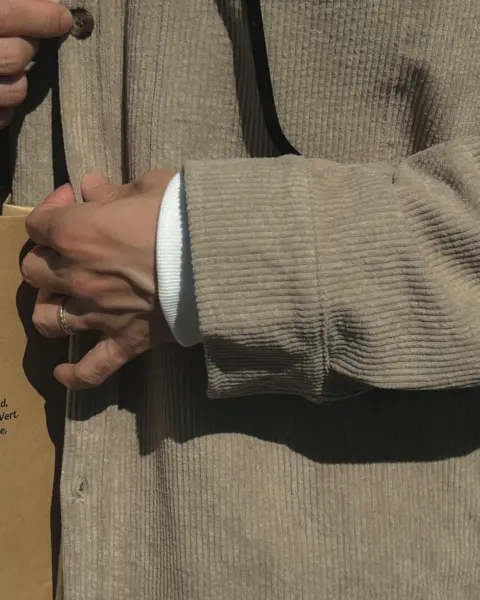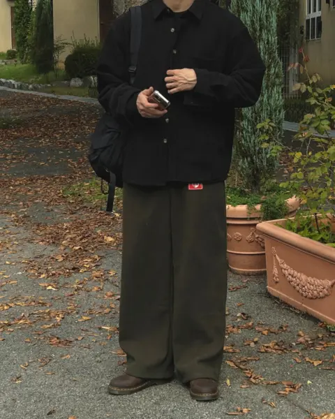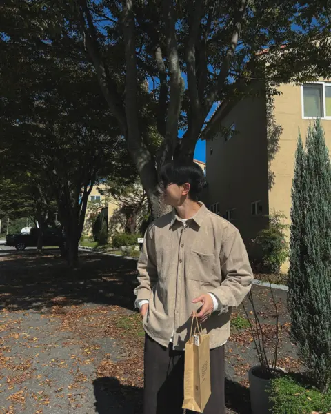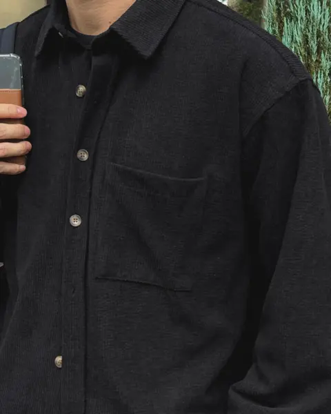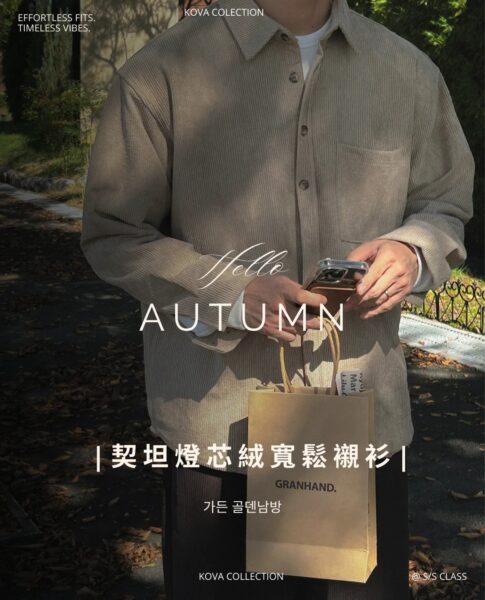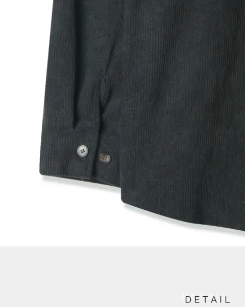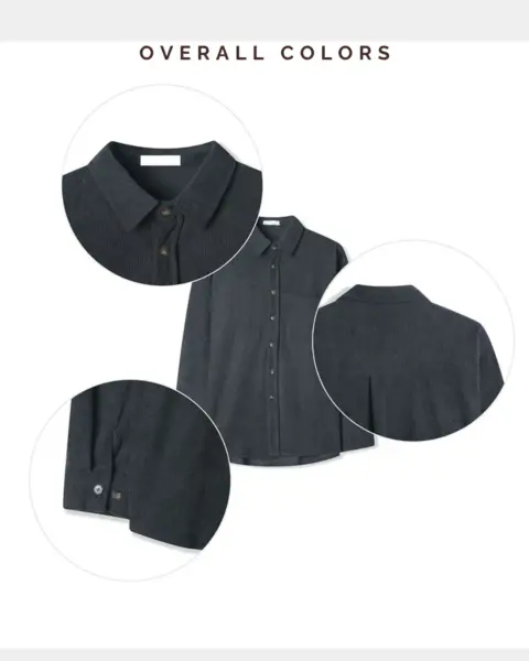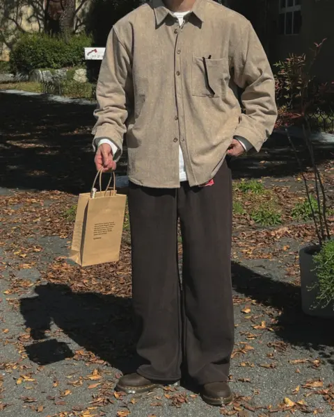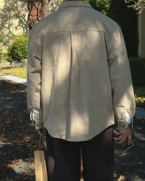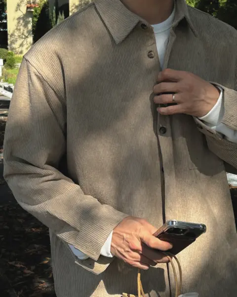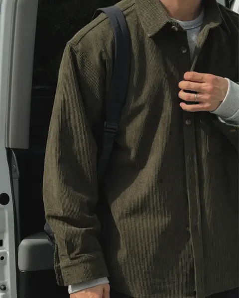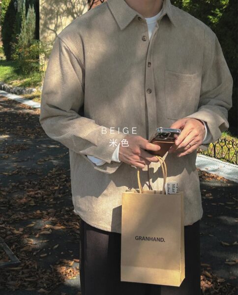 以「燈芯絨 골덴」面料製作的寬鬆版型襯衫,厚度偏有份量,穿起來更像外套感的襯衫外搭;單穿也行,搭在 T-shirt 外面當層次外套更好看。此款為海外生產,官方主打價格友善;尺寸為 F,建議穿著範圍約 95–110。
