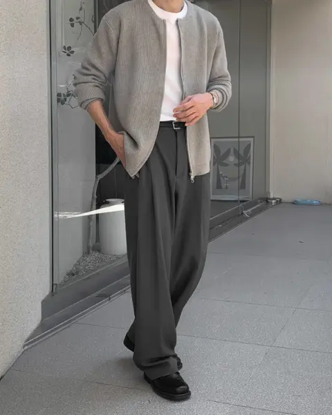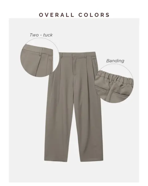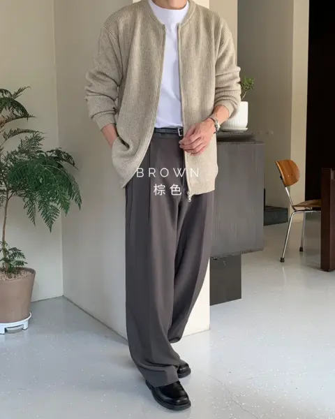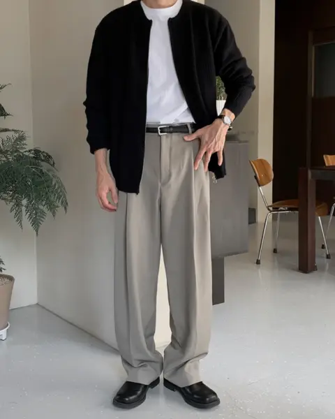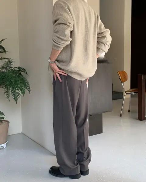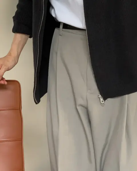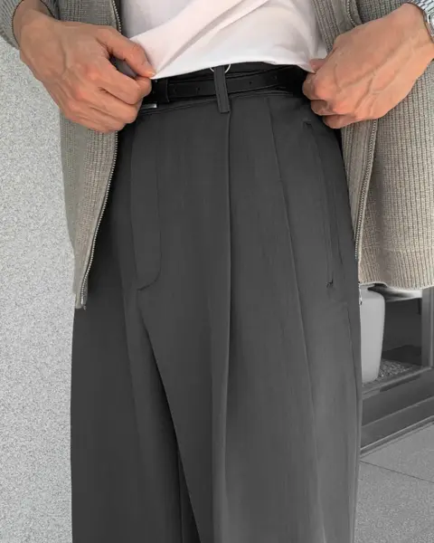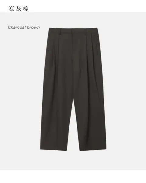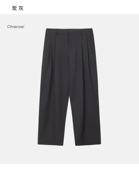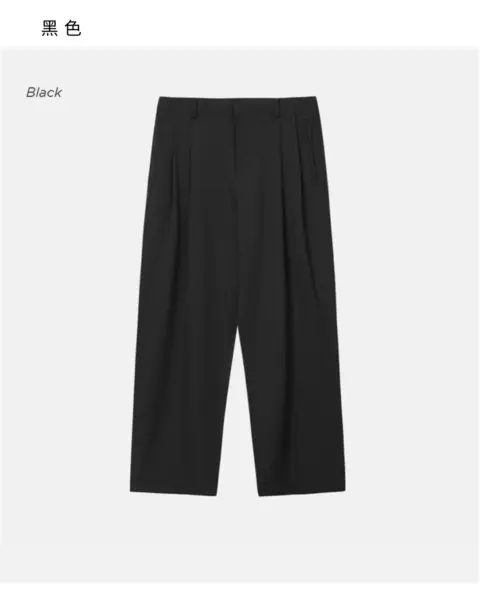 選用高密度 T/R 混紡面料製作,布性扎實挺順,穿著時自然垂墜,整體質感偏向成熟俐落。