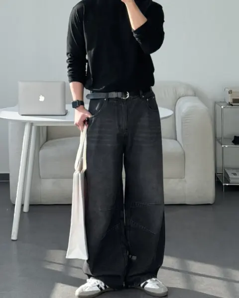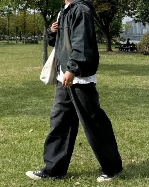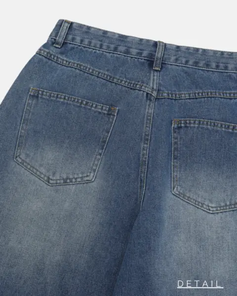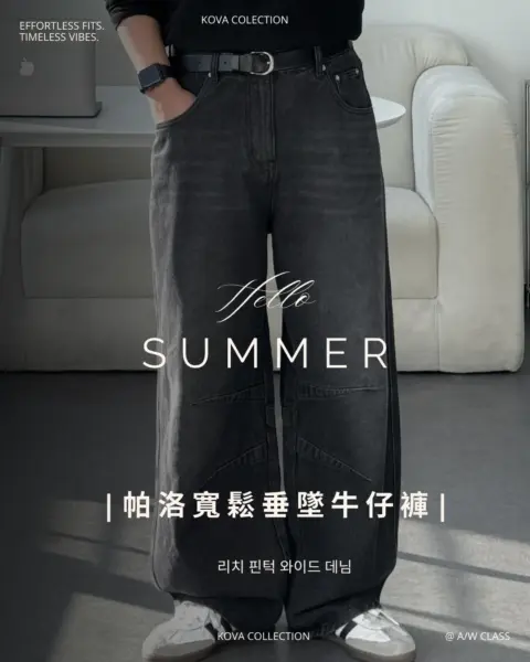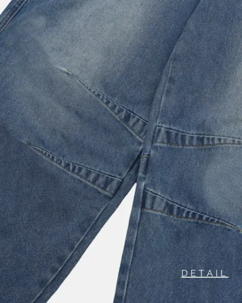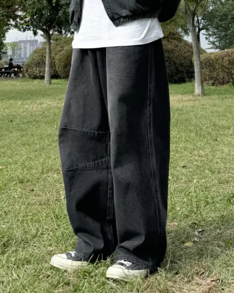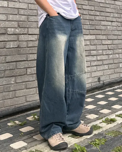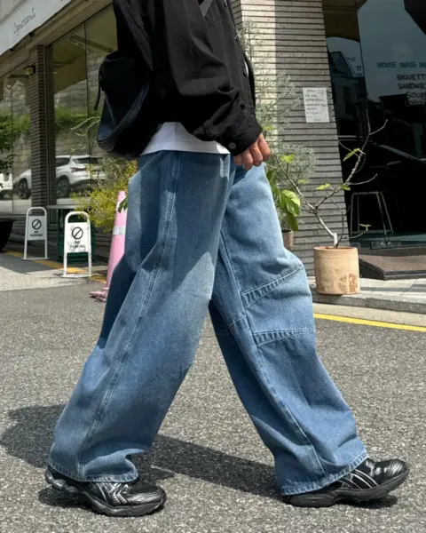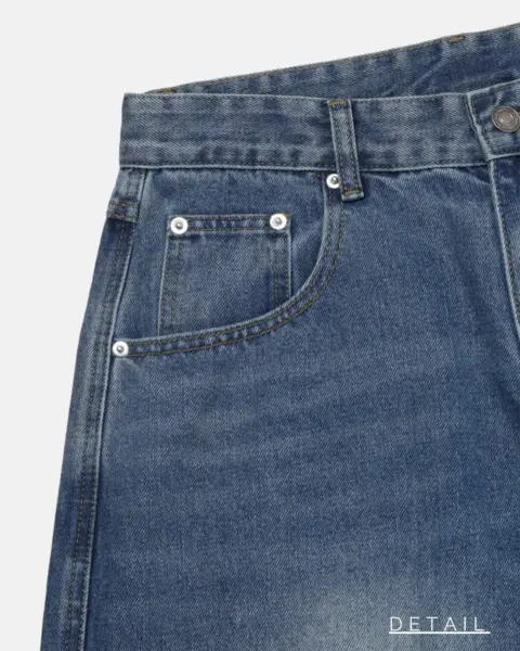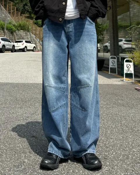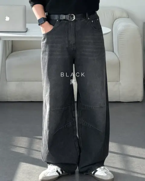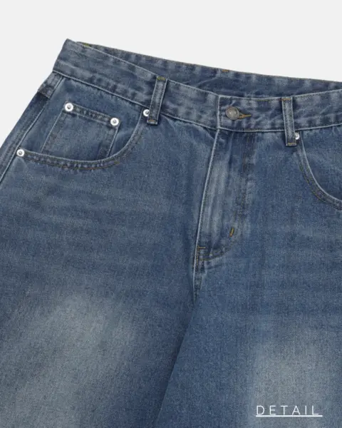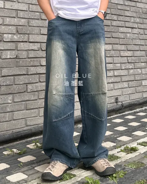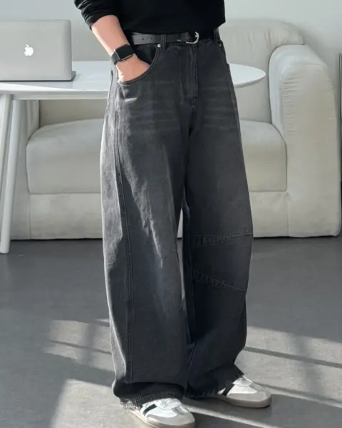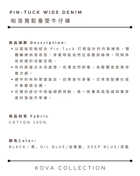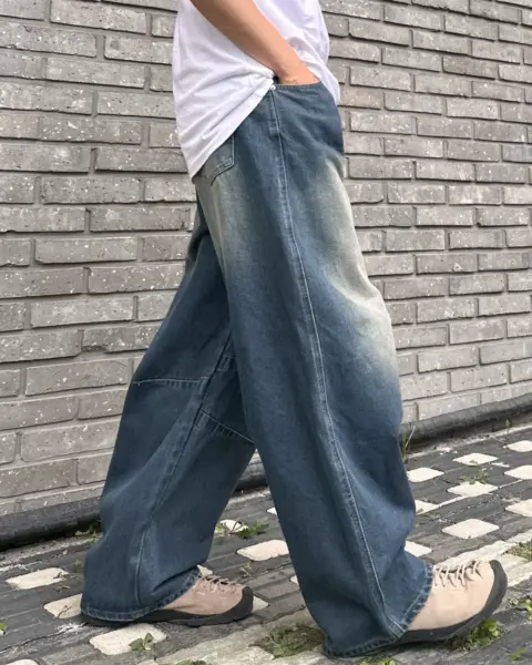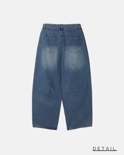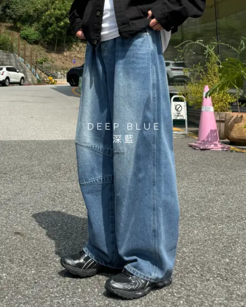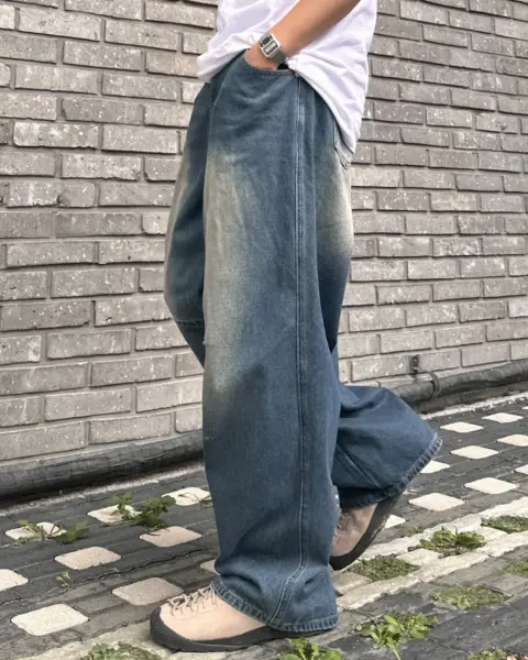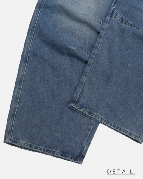 這款丹寧褲以寬版 wide 輪廓為主,整體做成帶點復古感的刷色水洗,穿起來有自然舊化氛圍,但線條依然乾淨俐落。褲身加入 pin-tuck 立體打摺,讓寬鬆褲型更挺、更有輪廓,不會軟塌或貼腿。布料厚度屬於四季都好穿的類型,日常搭配 T-shirt、襯衫或外套都很順,一條就能把整體穿搭撐起來。