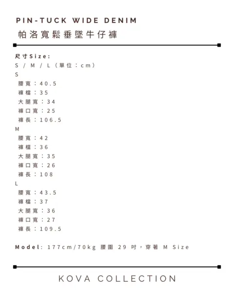 L:腰寬 43.5 / 褲檔 37 / 大腿寬 36 / 褲口寬 27 / 褲長 109.5