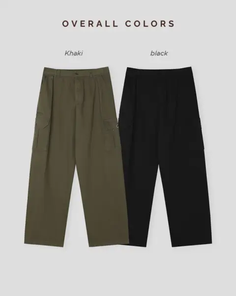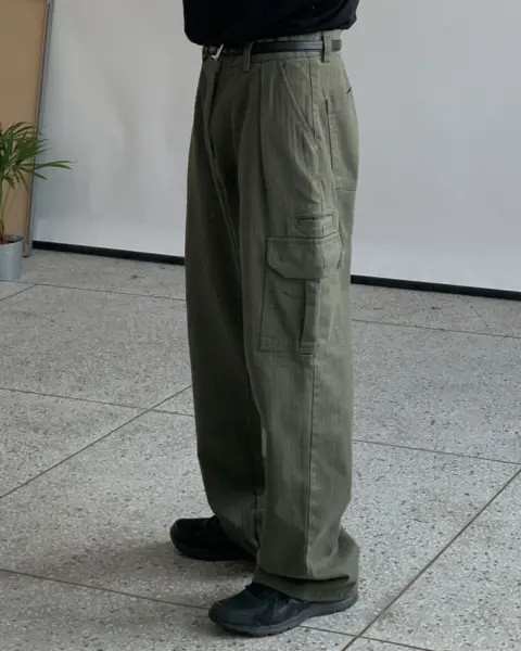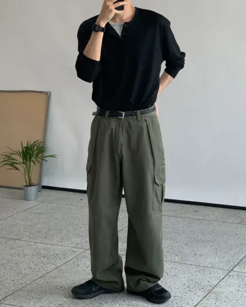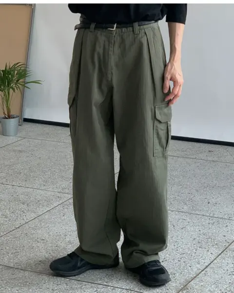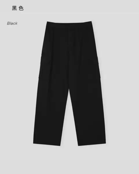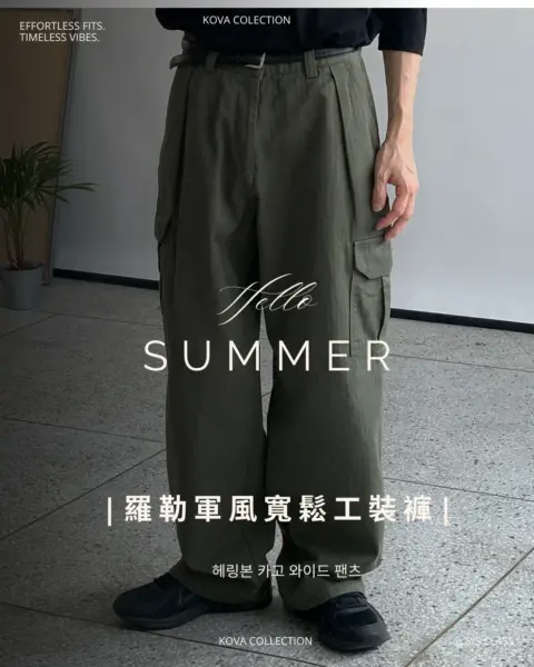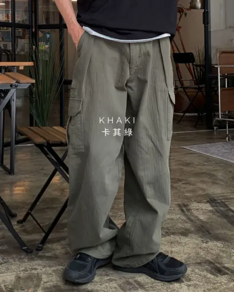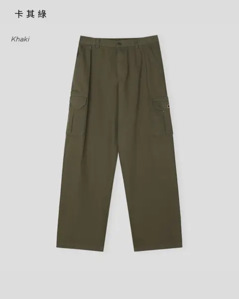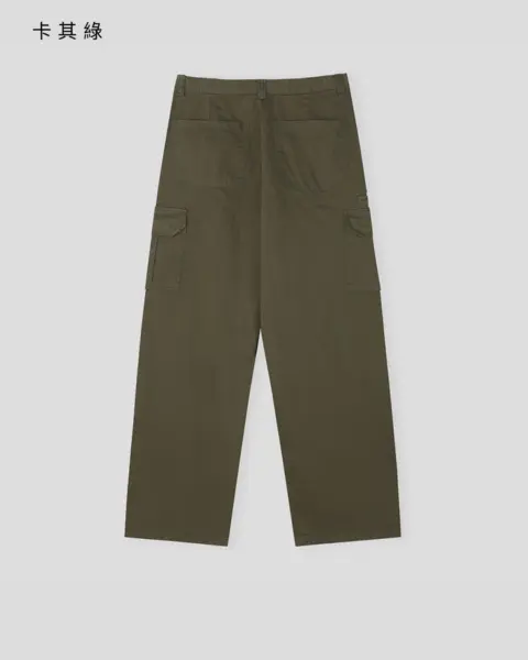 整體呈現寬鬆、自然的工裝寬褲輪廓