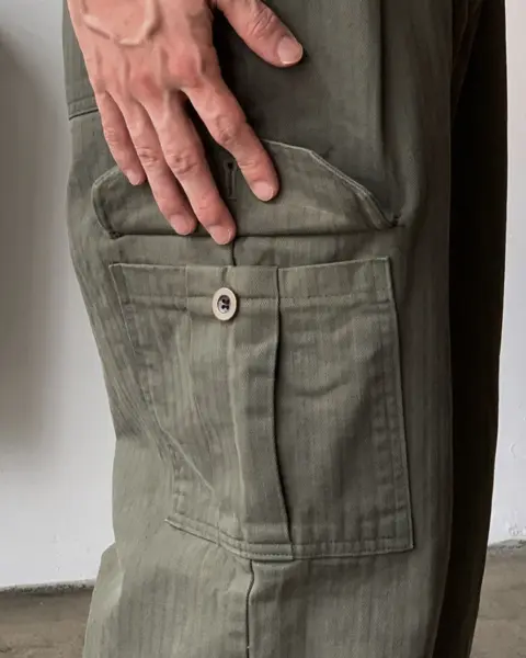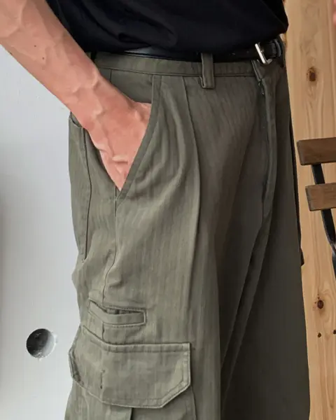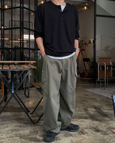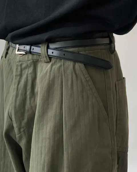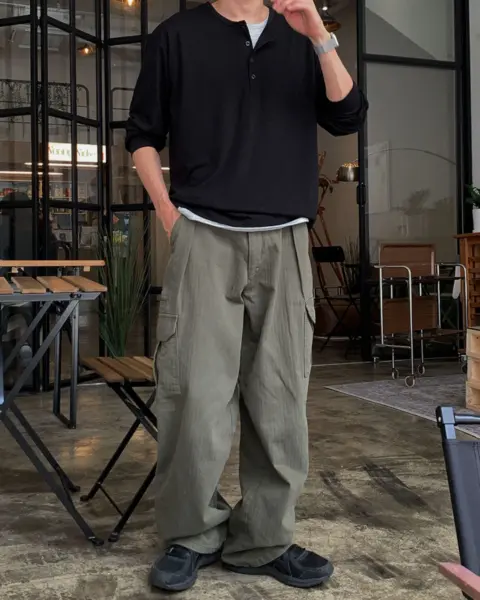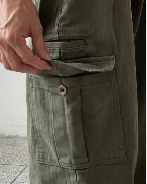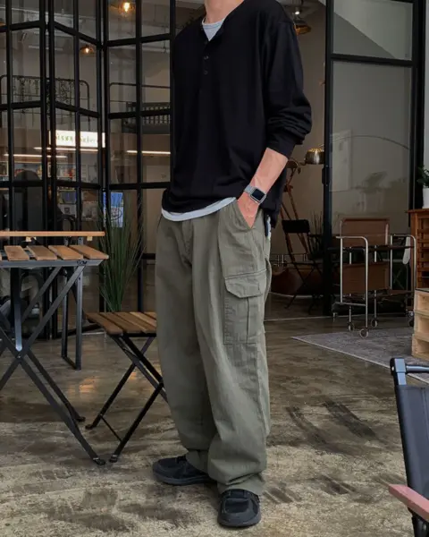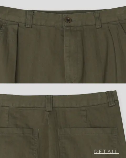 寬鬆版型搭配單褶線設計,結合工裝口袋與迷你收納口袋,兼具造型感與實用性。