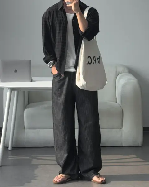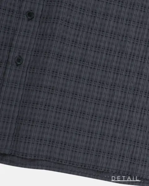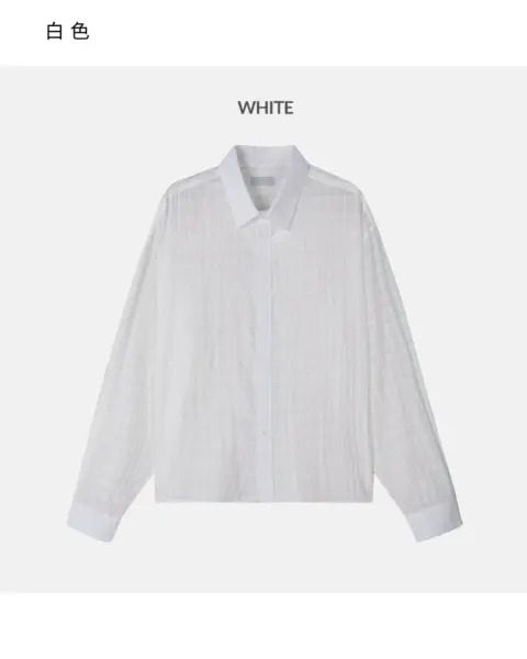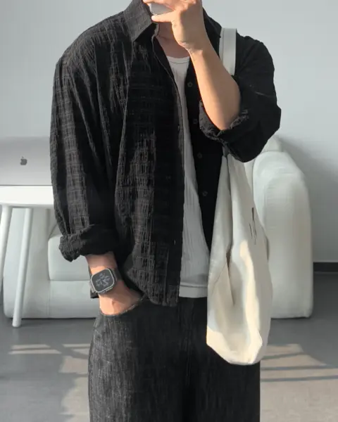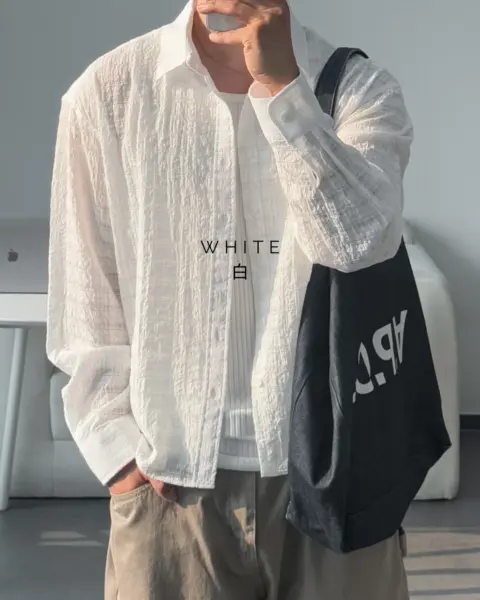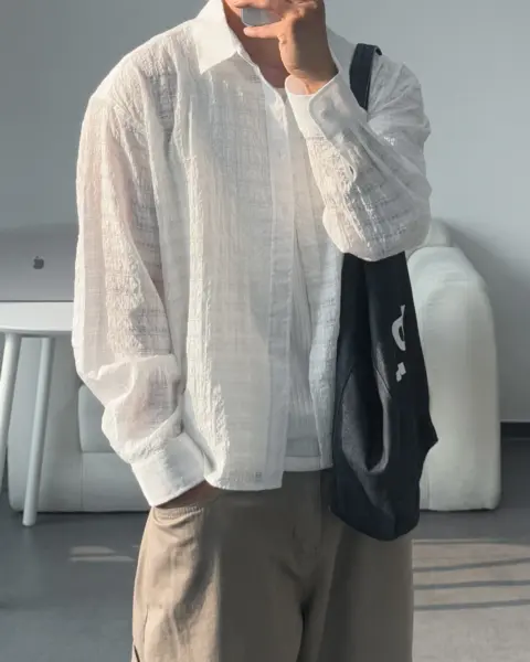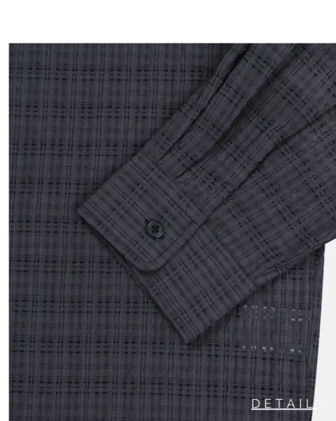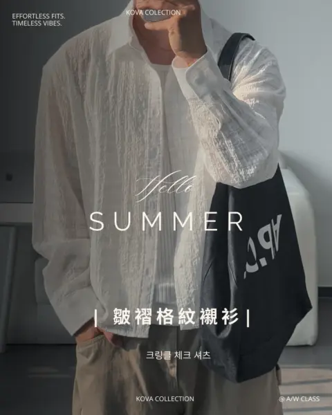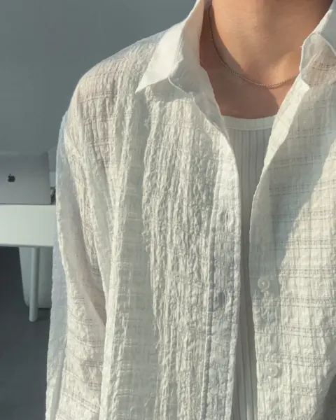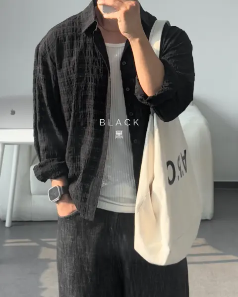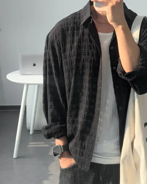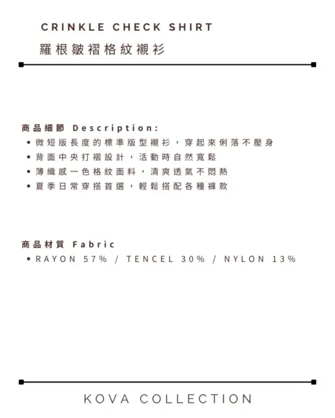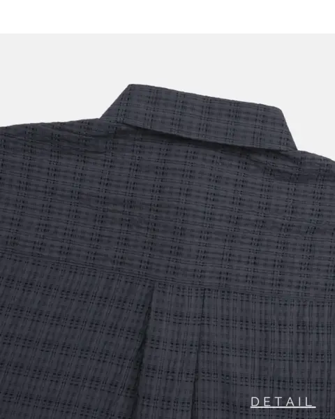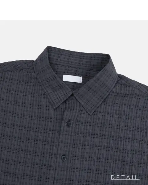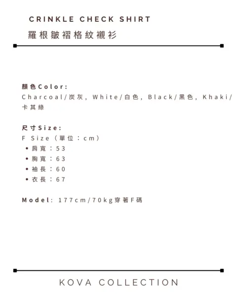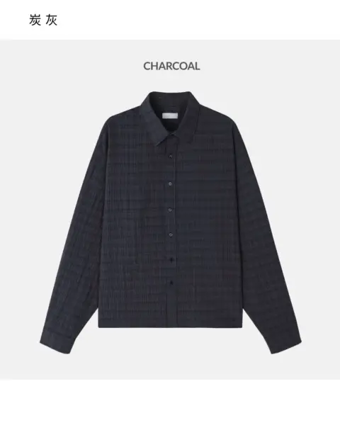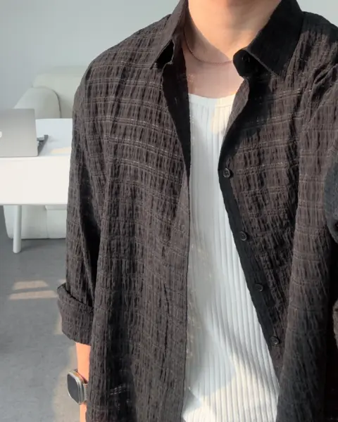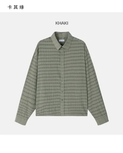 這款是帶有 Crinkle(微皺肌理) 的格紋襯衫,布面有自然立體紋理,不用刻意整燙也能維持俐落層次。整體屬於 不厚重、透氣度佳 的日常襯衫取向,單穿清爽、疊穿也不會顯得臃腫。