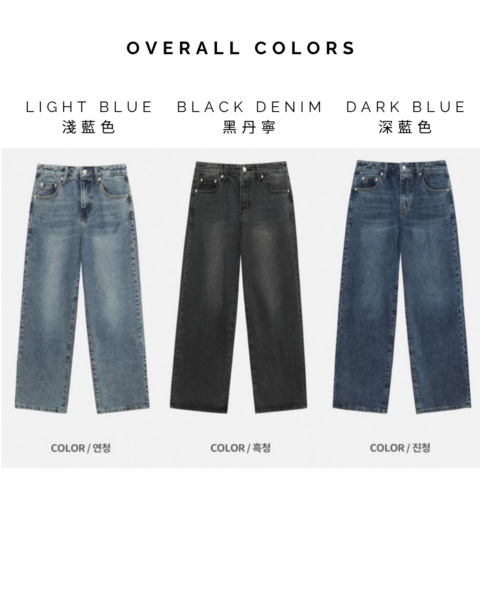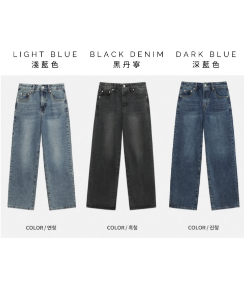 LIGHT BLUE|淺藍|연청, DARK BLUE|深藍|진청, BLACK DENIM|黑丹寧|흑청