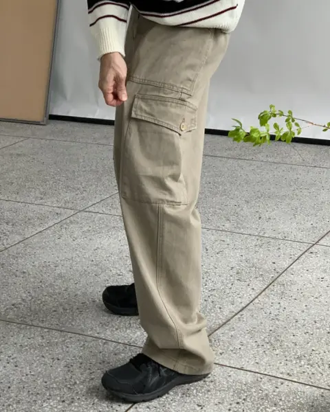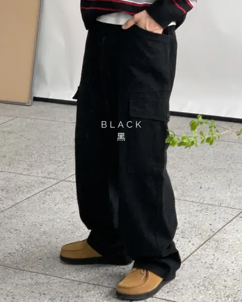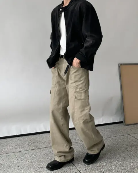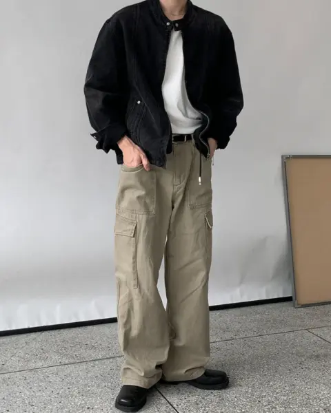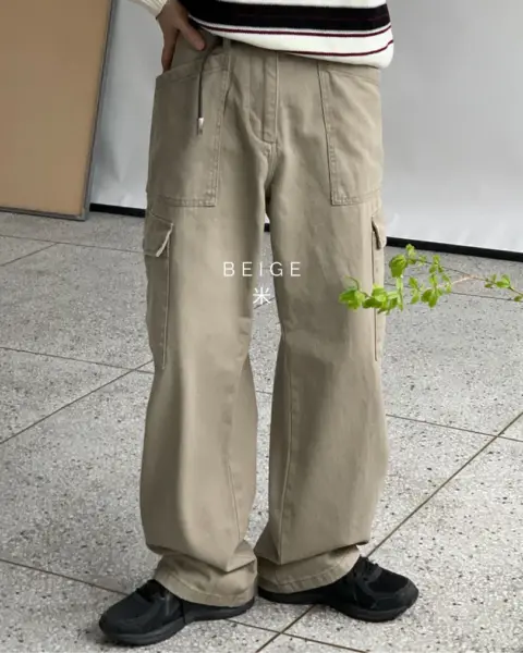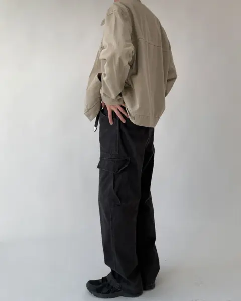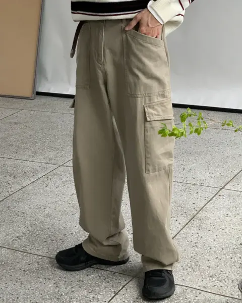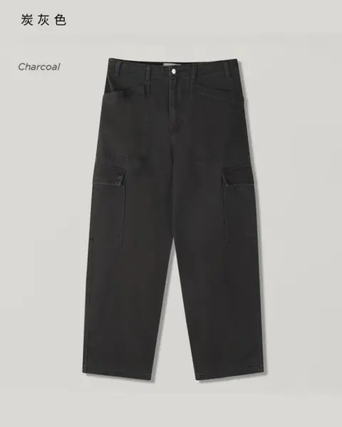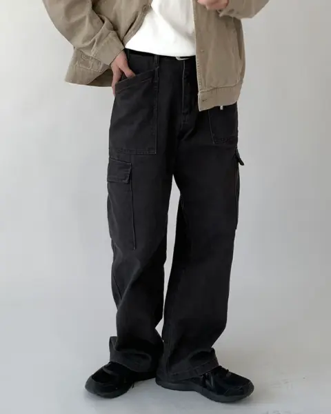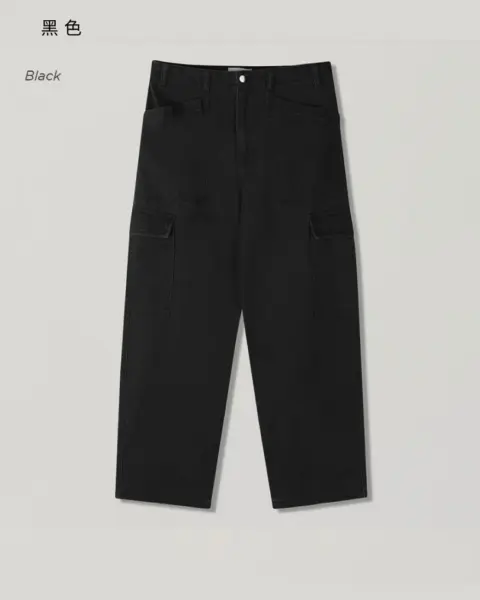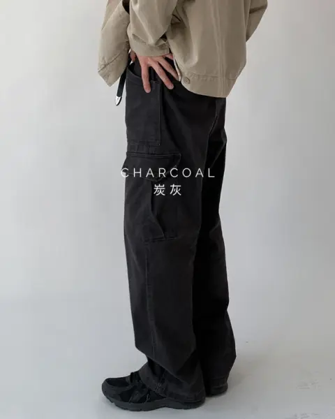 整體為 寬鬆 Wide Fit 剪裁,褲型線條俐落,搭配大容量口袋與 Cargo 工裝細節,兼具造型感與實用性。