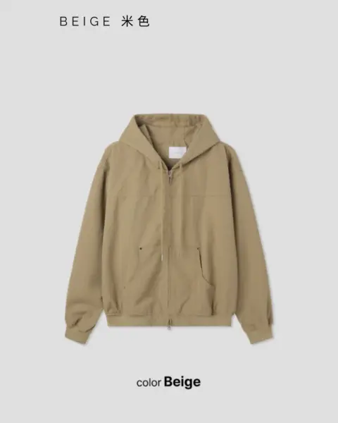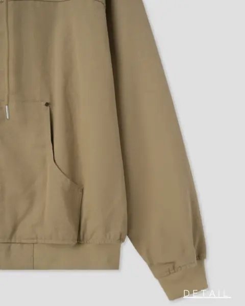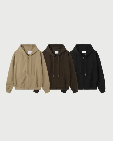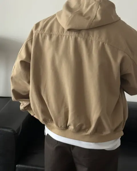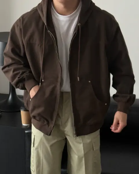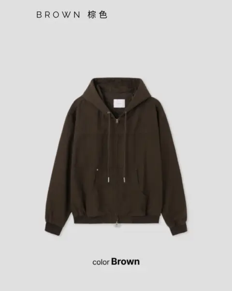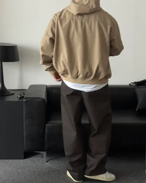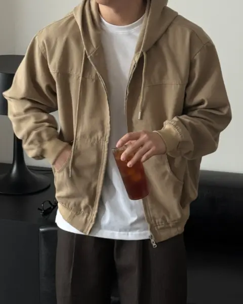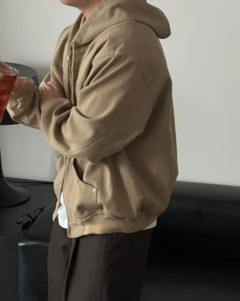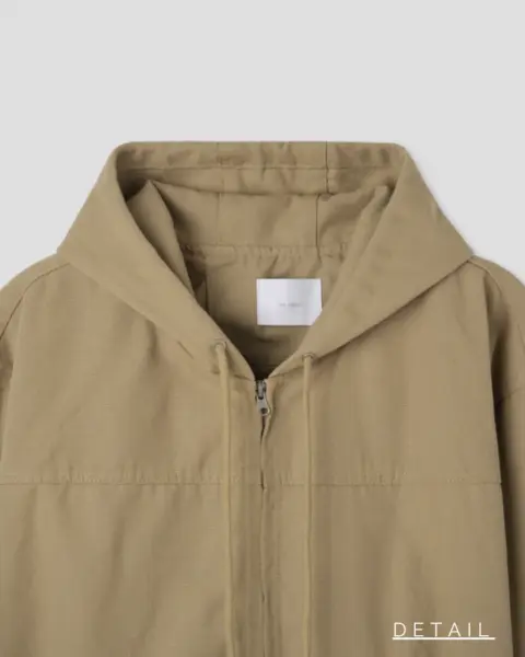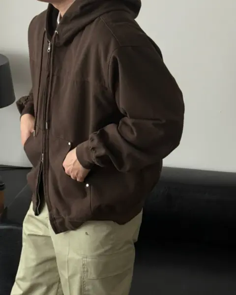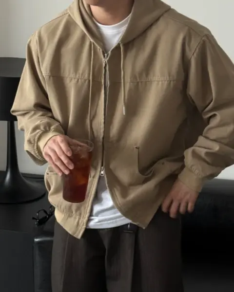 這款為帶有 workwear 氛圍的連帽外套,整體設計乾淨俐落,沒有多餘裝飾但細節到位。布料手感扎實並帶水洗色感,使整體更耐看;版型偏寬鬆,內搭針織或 T-shirt 都很順。外套本身具備 hood+절개(切線)設計,即使單穿也有層次,是秋冬很實用的日常外搭款。