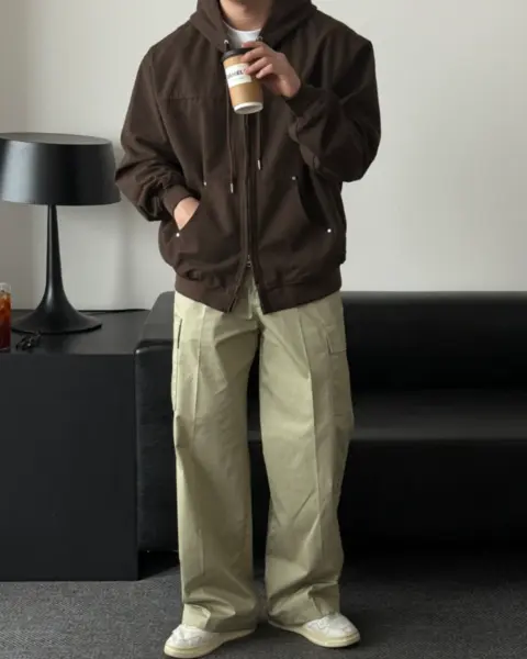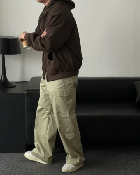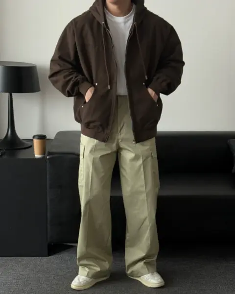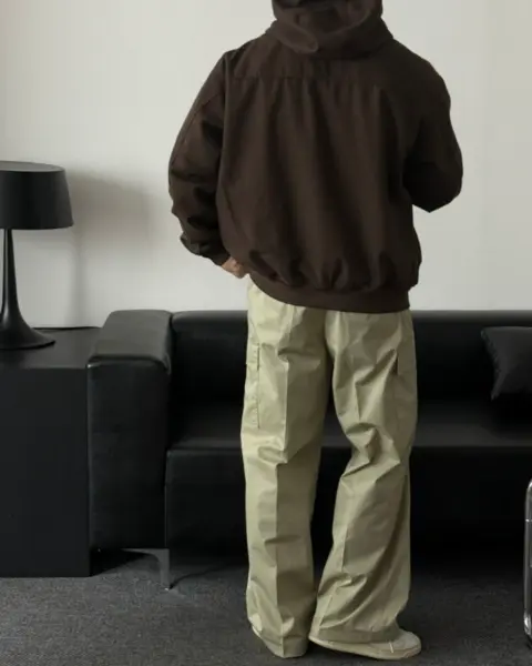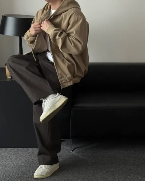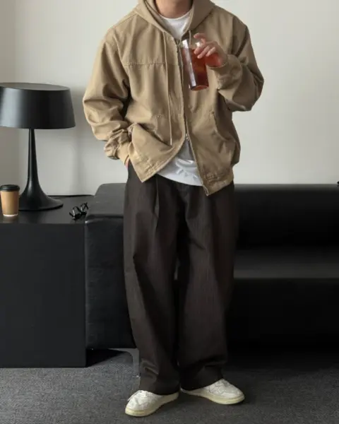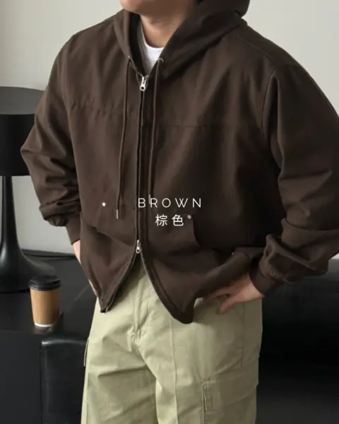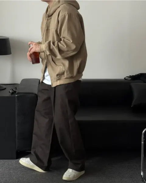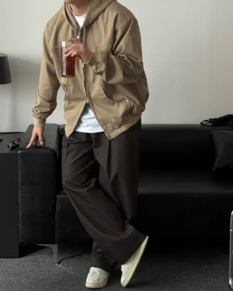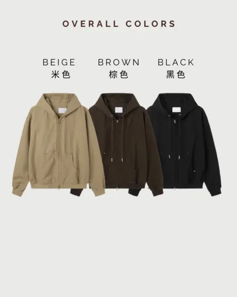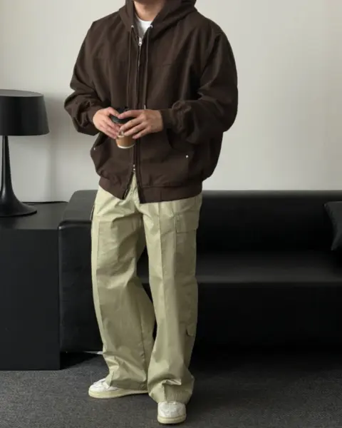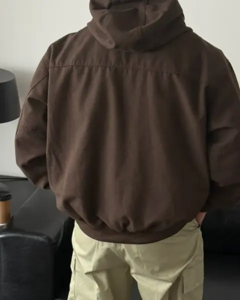 這款為帶有 workwear 氛圍的連帽外套,整體設計乾淨俐落,沒有多餘裝飾但細節到位。布料手感扎實並帶水洗色感,使整體更耐看;版型偏寬鬆,內搭針織或 T-shirt 都很順。外套本身具備 hood+절개(切線)設計,即使單穿也有層次,是秋冬很實用的日常外搭款。