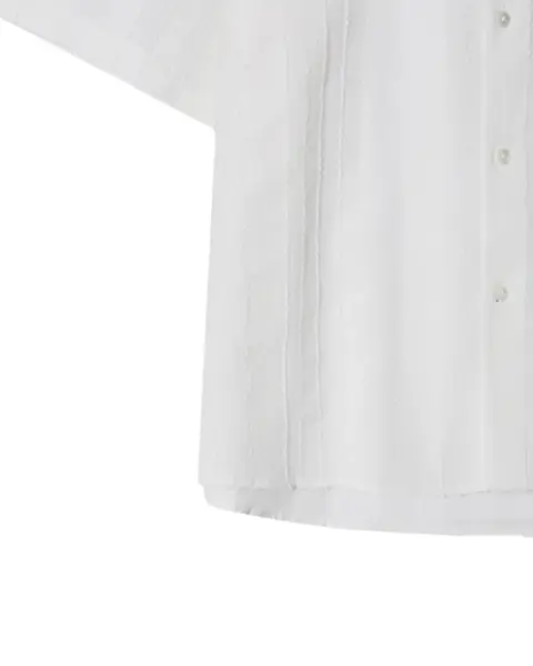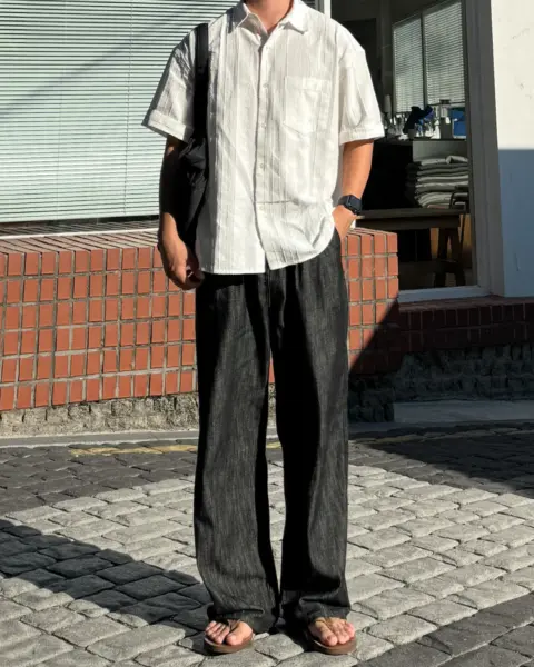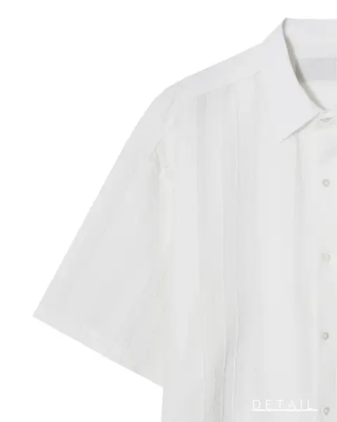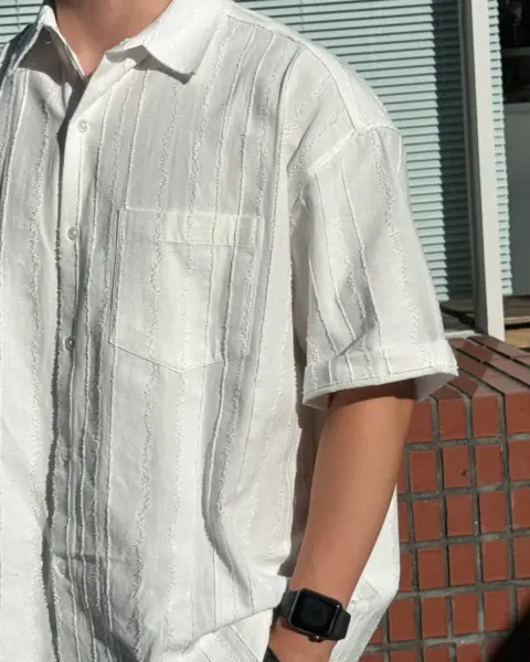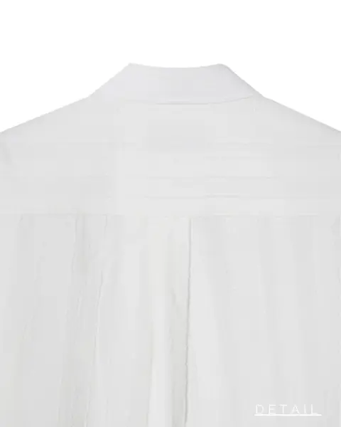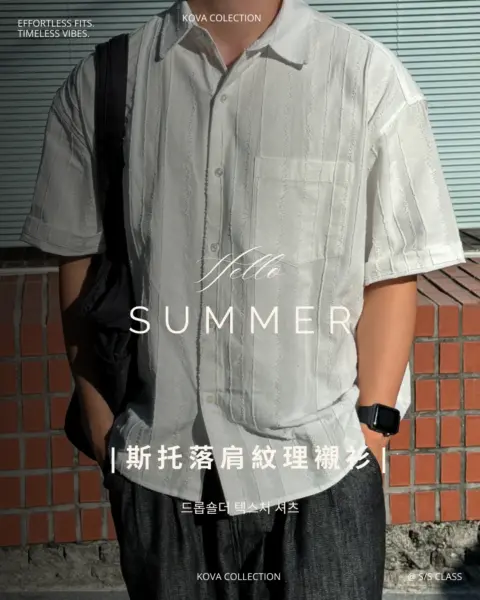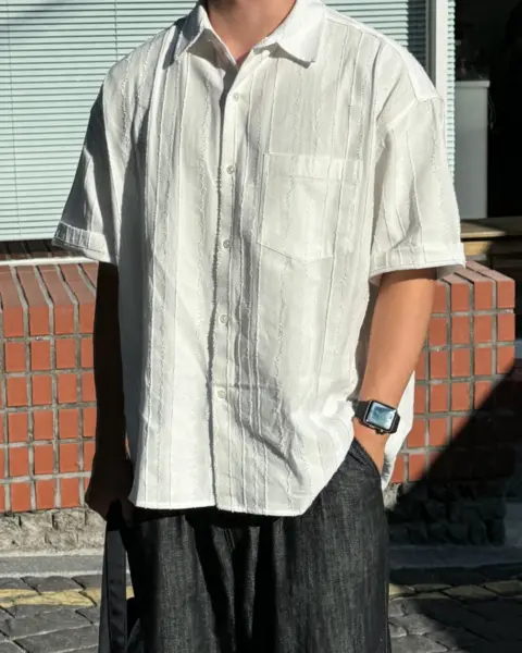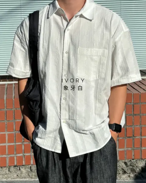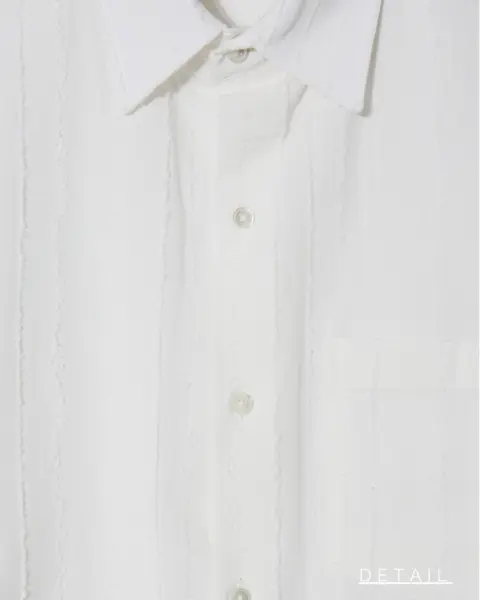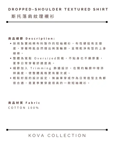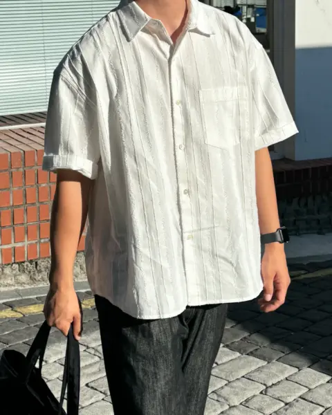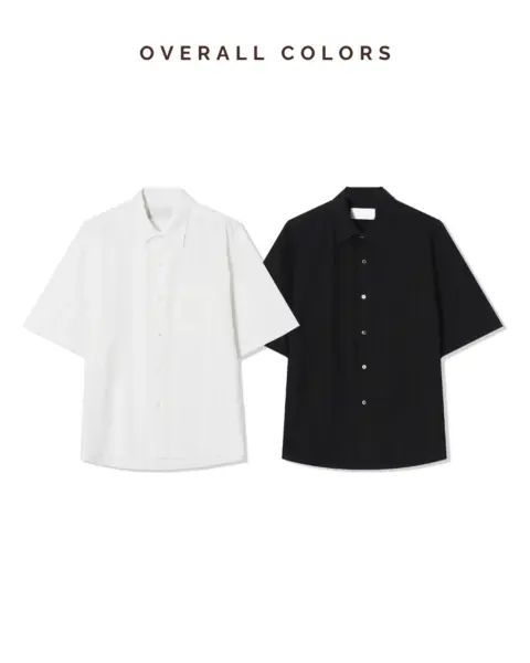 這款是用扎實的純棉面料做成的 over fit 半袖襯衫,版型寬鬆但線條乾淨,單穿就有俐落輪廓。設計上用 trimming 收邊/拼接感細節做出低調的辨識度,看起來不花俏但很有質感;夏天當日常主力、或當罩衫外搭都很適合。