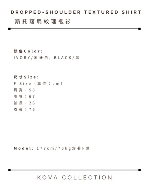 F:肩寬 58 / 胸寬 67 / 袖長 26 / 總長 76(不含領)