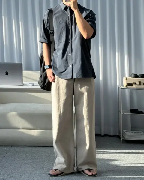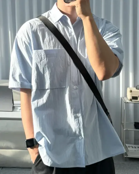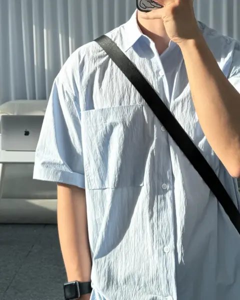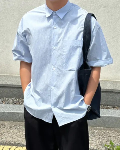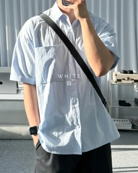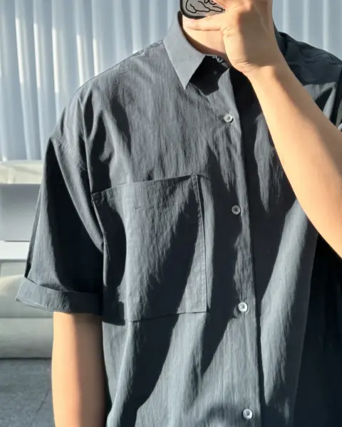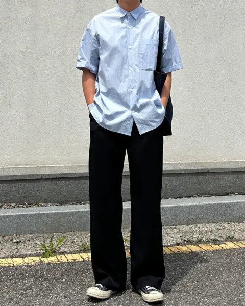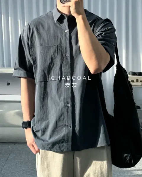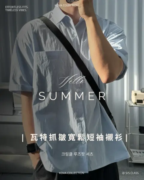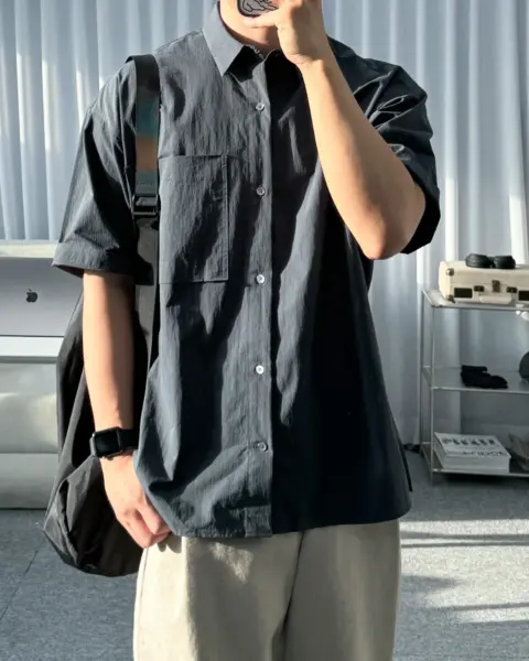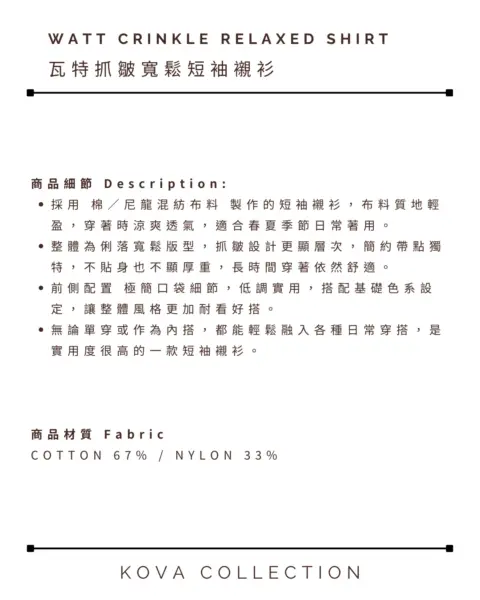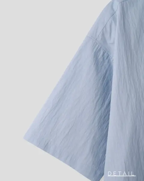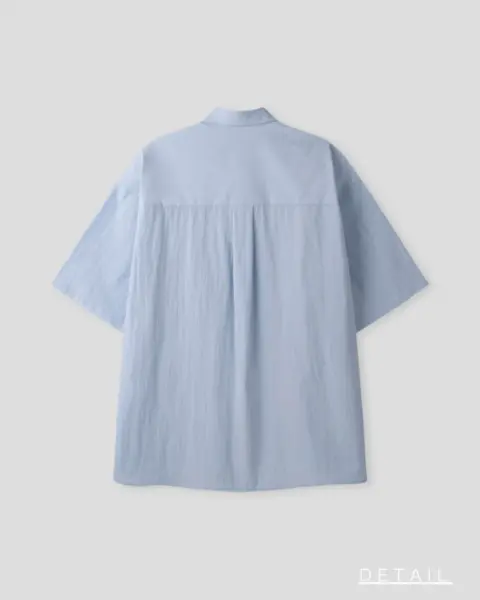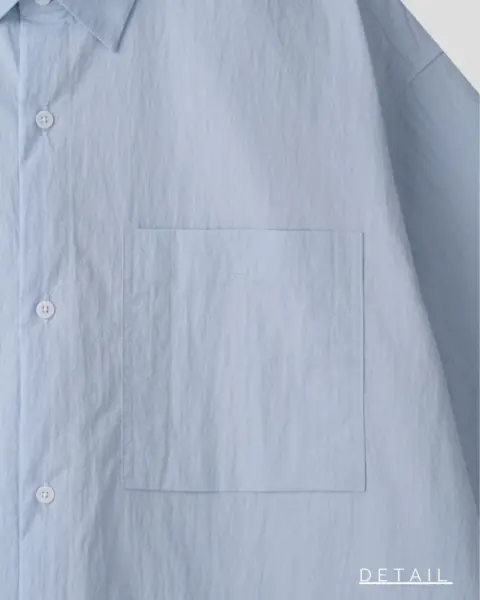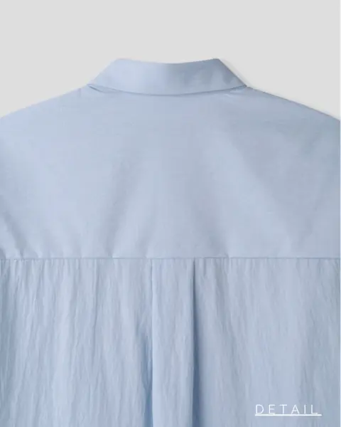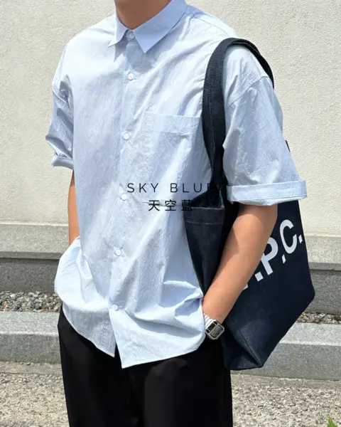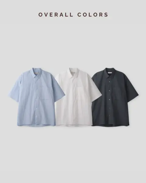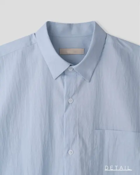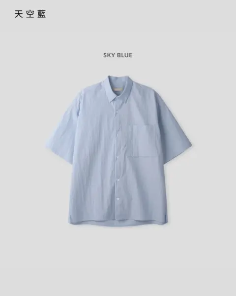 這款是以棉/尼龍混紡製作的短袖襯衫,面料輕薄、穿起來偏涼爽,夏天單穿就很舒服。正面做了極簡小口袋細節,整體走乾淨俐落的路線;配色也都是很基本的百搭色,不管搭丹寧、工裝褲或短褲都很好用。平常穿上衣 100 號的模特穿 F 也會有寬鬆餘裕感。