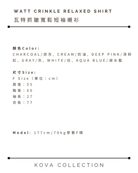 F:肩寬 55 / 胸寬 60 / 袖長 27 / 總長 77(不含領)