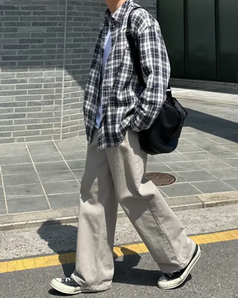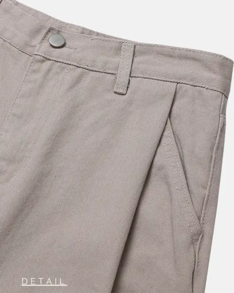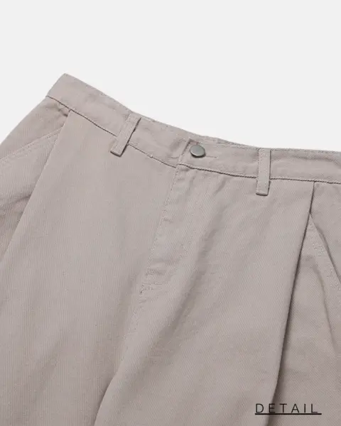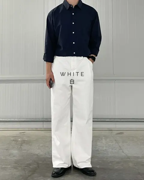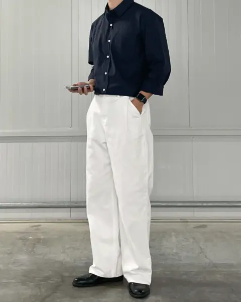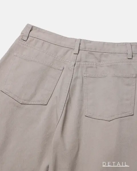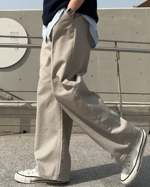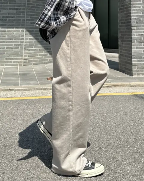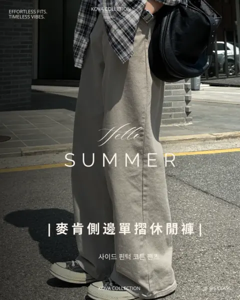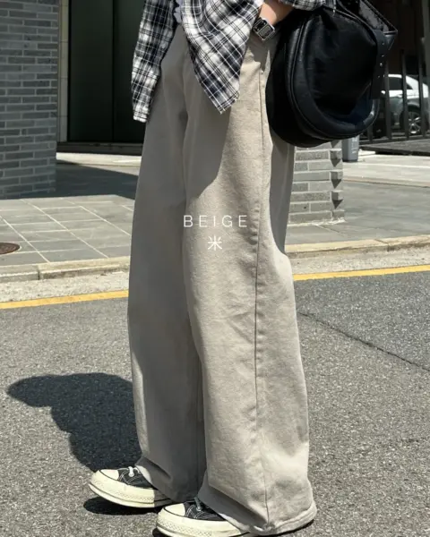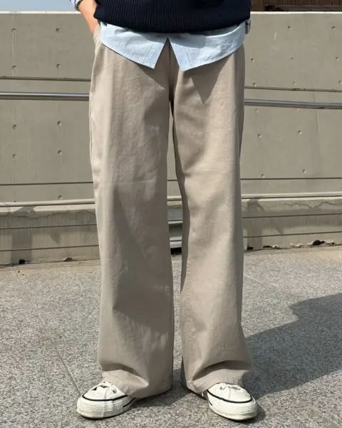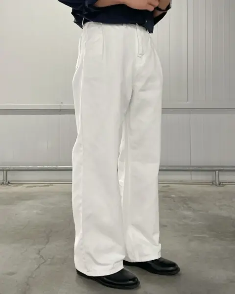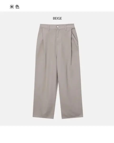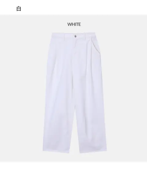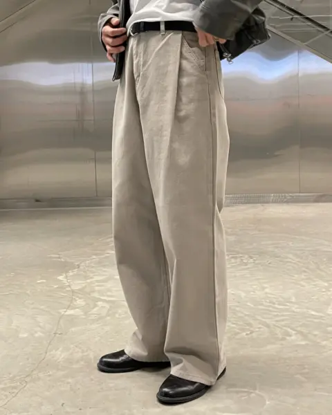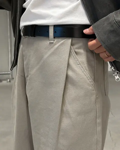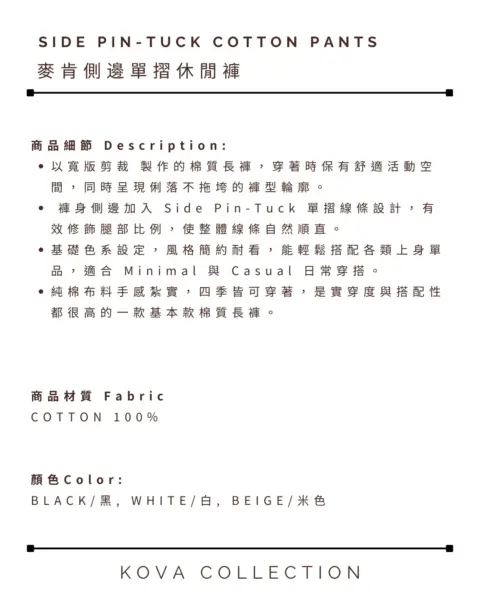 這款是 COTTON 100% 的棉料寬褲,版型走 wide fit,穿起來寬鬆但線條很乾淨。側邊加入 side pin-tuck 側邊壓摺,讓褲管輪廓更順、更俐落,整體看起來有挺度但不會硬或卡。配色都是基本百搭色,無論做極簡風或休閒穿搭都很好搭。