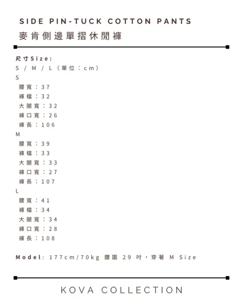 M:腰寬 39 / 褲檔 33 / 大腿寬 33 / 褲口寬 27 / 褲長 107