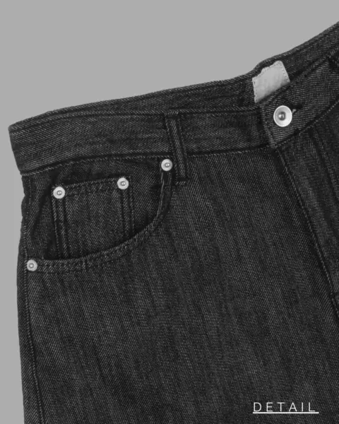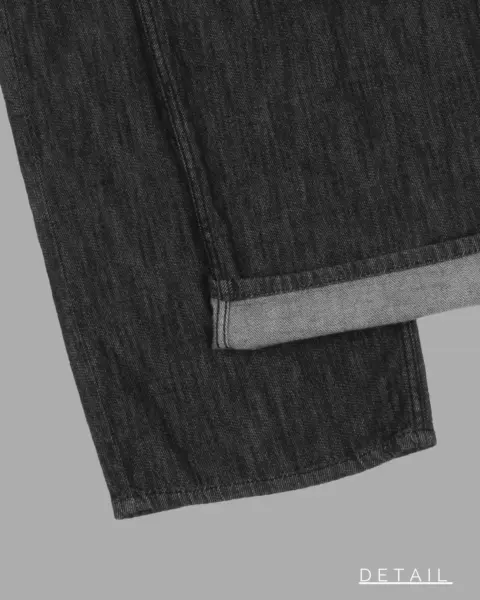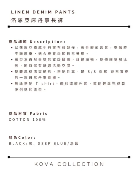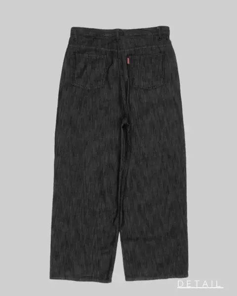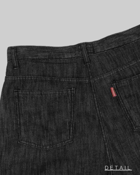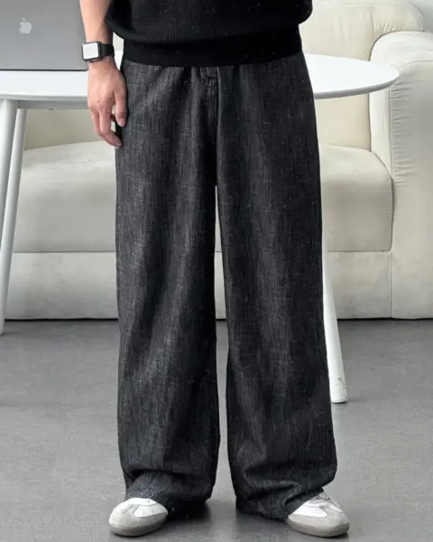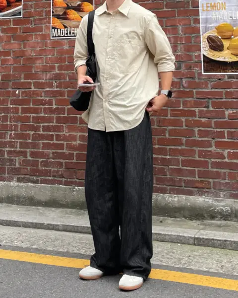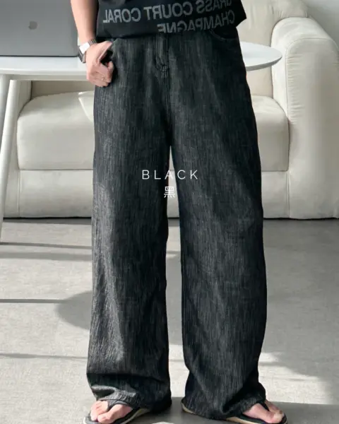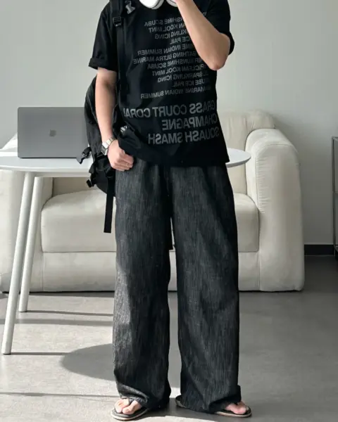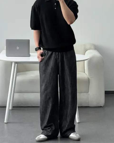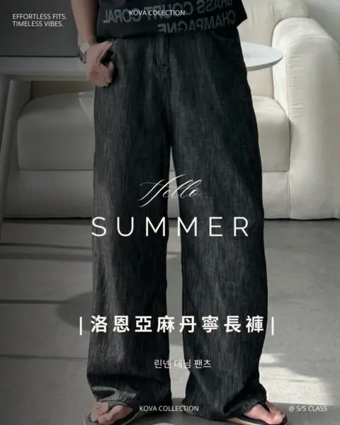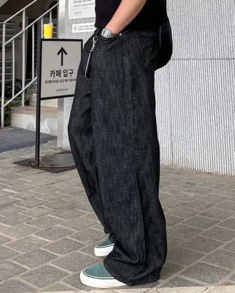 這款是偏春夏取向的「亞麻感丹寧褲」,布料厚度較輕薄,穿起來不悶熱,走動時也會有自然的垂墜感。版型採 wide fit,從大腿一路順順往下落,線條乾淨俐落、不貼腿,整體看起來輕鬆但不鬆垮。日常不管搭 T-shirt、襯衫或外套都很好駕馭,是一條很能當作換季日常主力的寬褲。