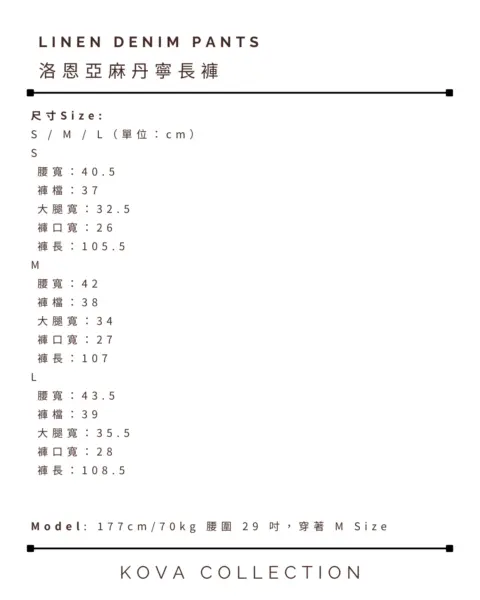 L:腰寬 43.5 / 褲檔 39 / 大腿寬 35.5 / 褲口寬 28 / 褲長 108.5